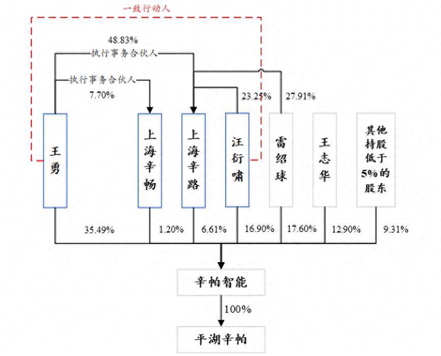 股权结构方面,王勇直接持有辛帕智能35.49%股份,通过上海辛畅、上海辛路间接控制公司7.81%股份,并通过与汪衍啸签署《一致行动人协议》,控制公司16.90%股份。其合计控制辛帕智能60.20%股份,为公司控股股东、实际控制人。
